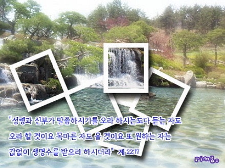 계 22:17 “성령과 신부가 말씀하시기를 오라 하시는도다 듣는 자도 오라 할 것이요 목마른 자도 올 것이요 또 원하는 자는 값없이 생명수를 받으라 하시더라”